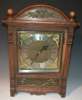 the domed top flanked by ball finials, above gilt decorated face within reeded columns, with carved shaped apron beneath gilt decorated panel