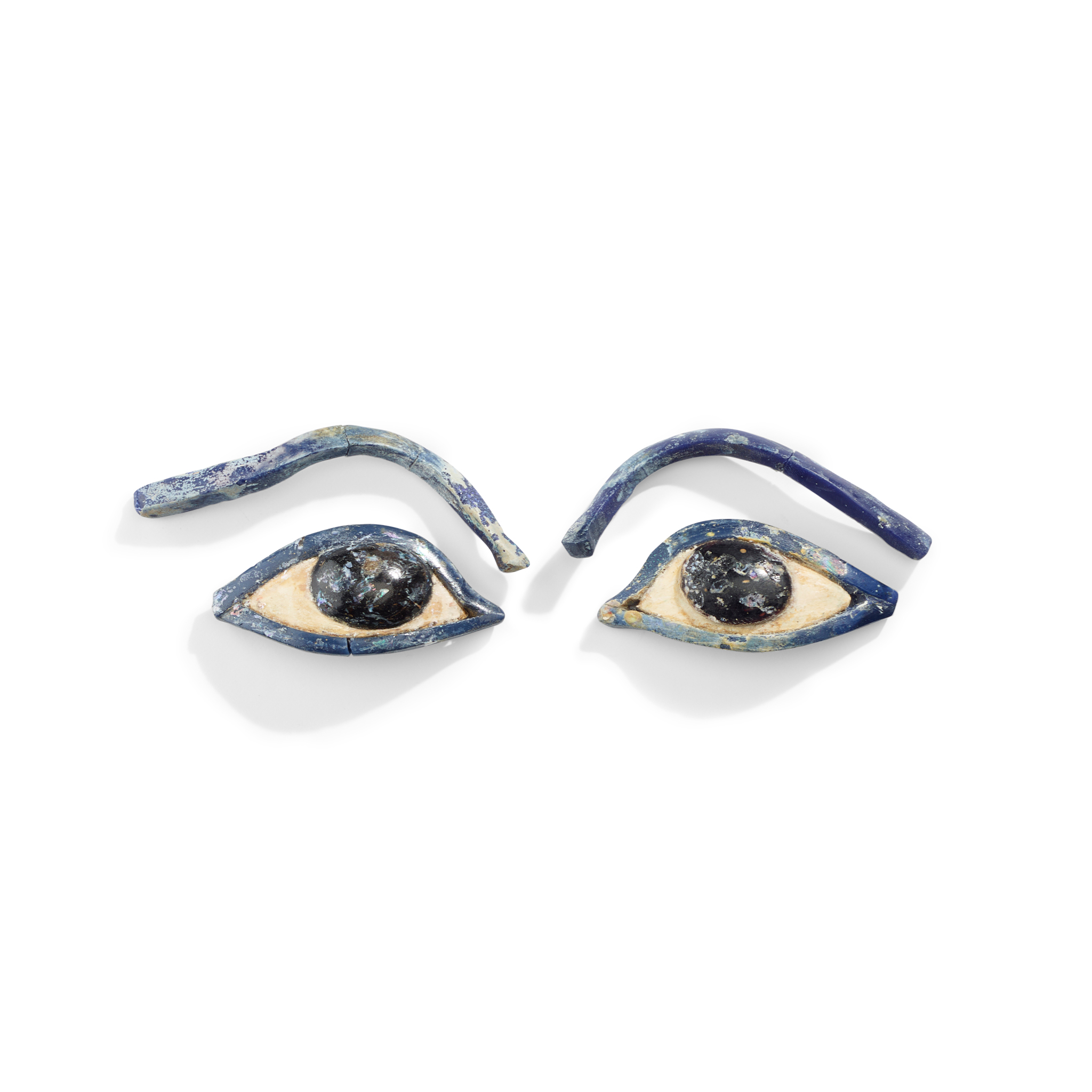 composed of white sclerae overlaid with dark glass to form the iris, framed by deep blue faience brows seperate cosmetic lines above