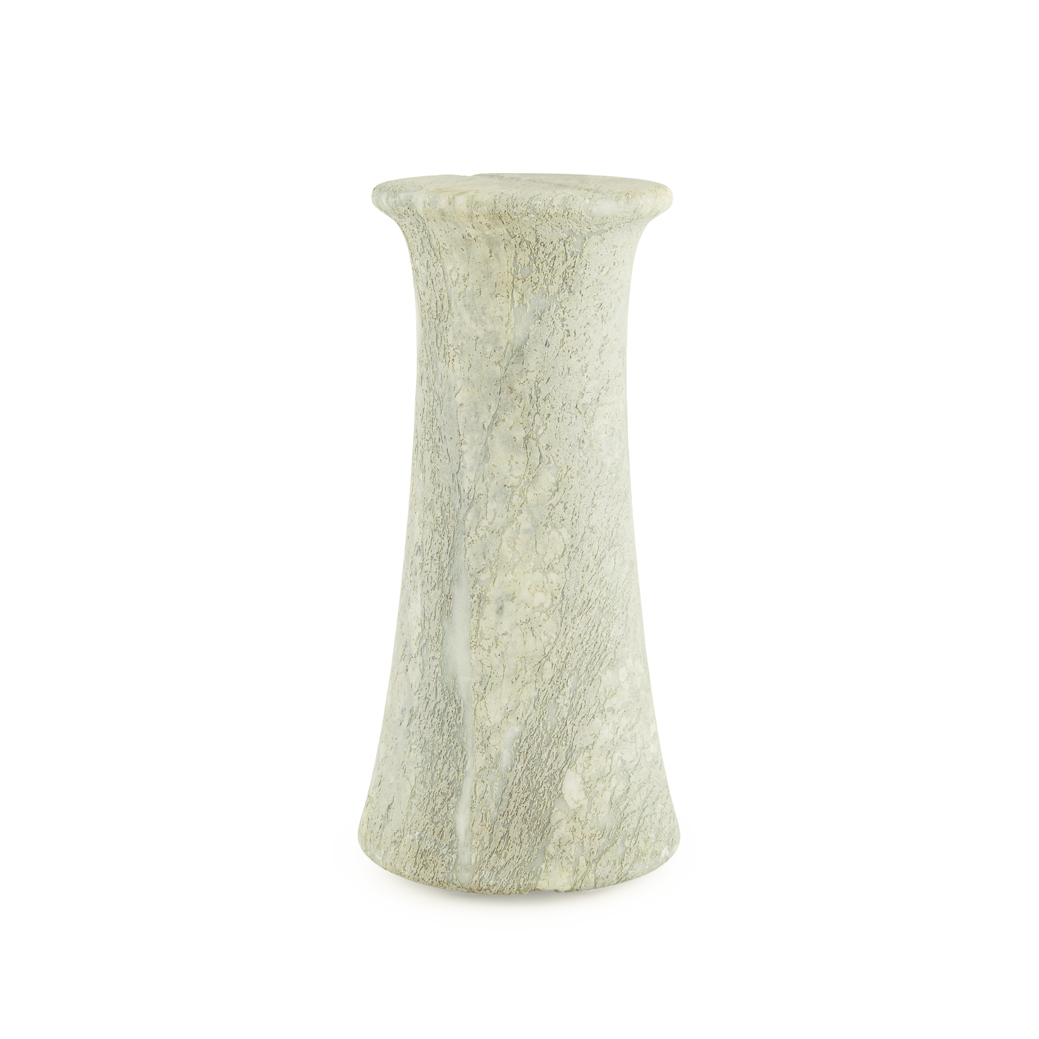 carved green marble, standing on a flat base with central groove, elegant cylindrical form, waisted body with a shallow groove at the top, the mottled green surface evoking swirling clouds