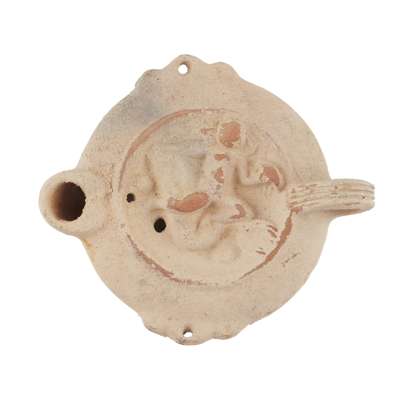 terracotta, the central discus featuring an image of a winged Cupid playing a double flute while riding a dolphin