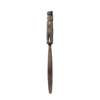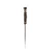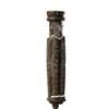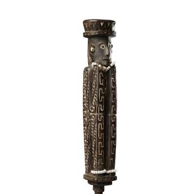 carved wood and lime, topped with a seated figure with a moustache and wearing a hat, with lime fill and white beads around the wrists and ankles