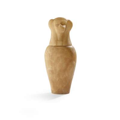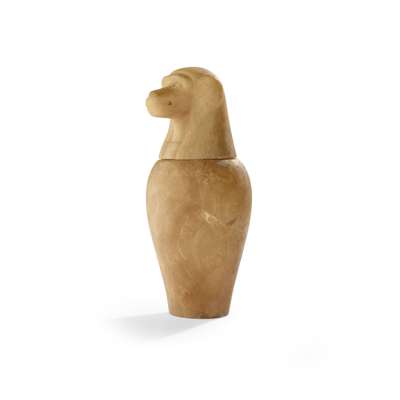 the lid sculpted in the form of a baboon head in depiction of one of the Four Sons of Horus, Hapi, with finely-modelled facial markings; with a cylindrical body swelling at the shoulder, and tapering to a flat base, the interior hollow
