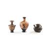 the first a black figure squat lekythos, showing a running figure between a man and a woman; the second a red figure squat lekythos with three handles, with a central palmette motif to the body, 9.5cm high, the third a blackware guttos with a single handle and long spout, 6.5cm high, 10cm wide (3)