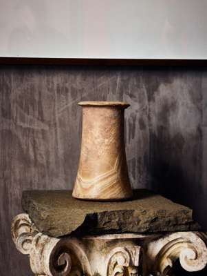 carved alabaster, cylindrical in form, flaring to the slightly rounded base, with an overhanging flat disk rim
