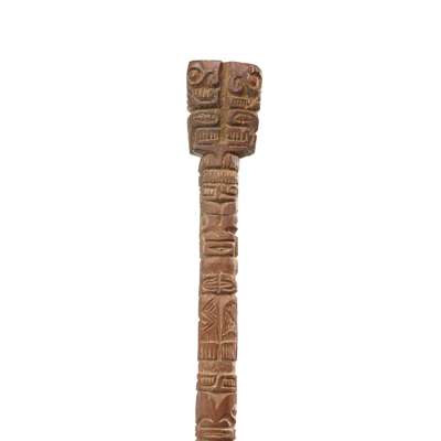 the whole profusely carved, with the finial showing two tiki figures, one behind the other, down to the typical lug at the bottom