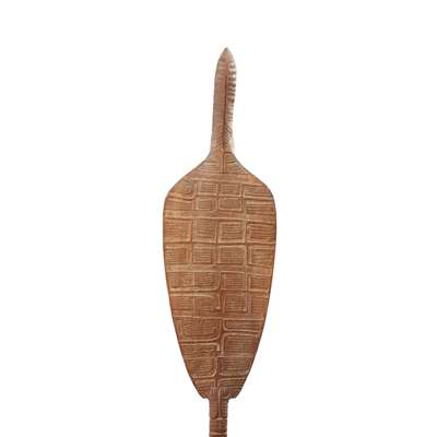 Marquesan paddles are of distinct shape, as the lug at the bottom was used to push along shallow reefs. The carving is similar to traditional tattoo designs.