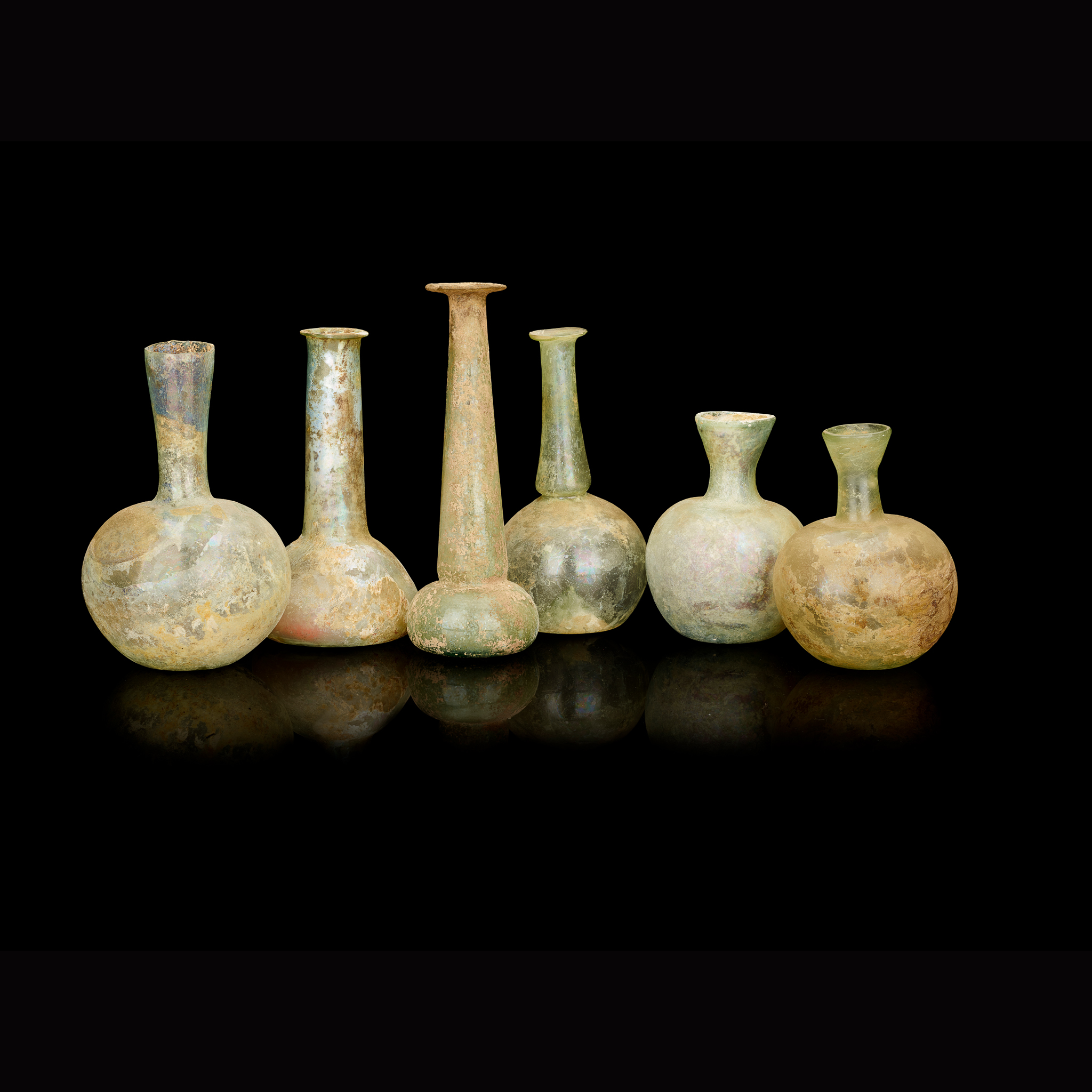 GROUP OF SIX ROMAN GLASS BOTTLES