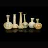 three with funnel-shaped necks over globular bodies, the largest 16.5cm high; together with a bottle with a slender neck with an indent at the base and flared rim over a globular body, 15.8cm high; one with a cylindrical neck slightly expanding downwards, over a squat bulbous body, with collection number 322 to the neck,16.2cm high; one with a small, squat body with a long tapering neck with wide flaring rim, with collection number 435 to the side, 18.7cm high; five with pink auction labels dated 18 MAY 1970 (6)