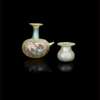 the first with a flared rim and ring base, with several faintly incised continuous horizontal lines; the second with a cylindrical body with flared rim and ring foot, with three incised lines across the lower body and a single line just under the rim, 6.7cm high; both with pink auction labels dated 18 MAY 1970 (2)