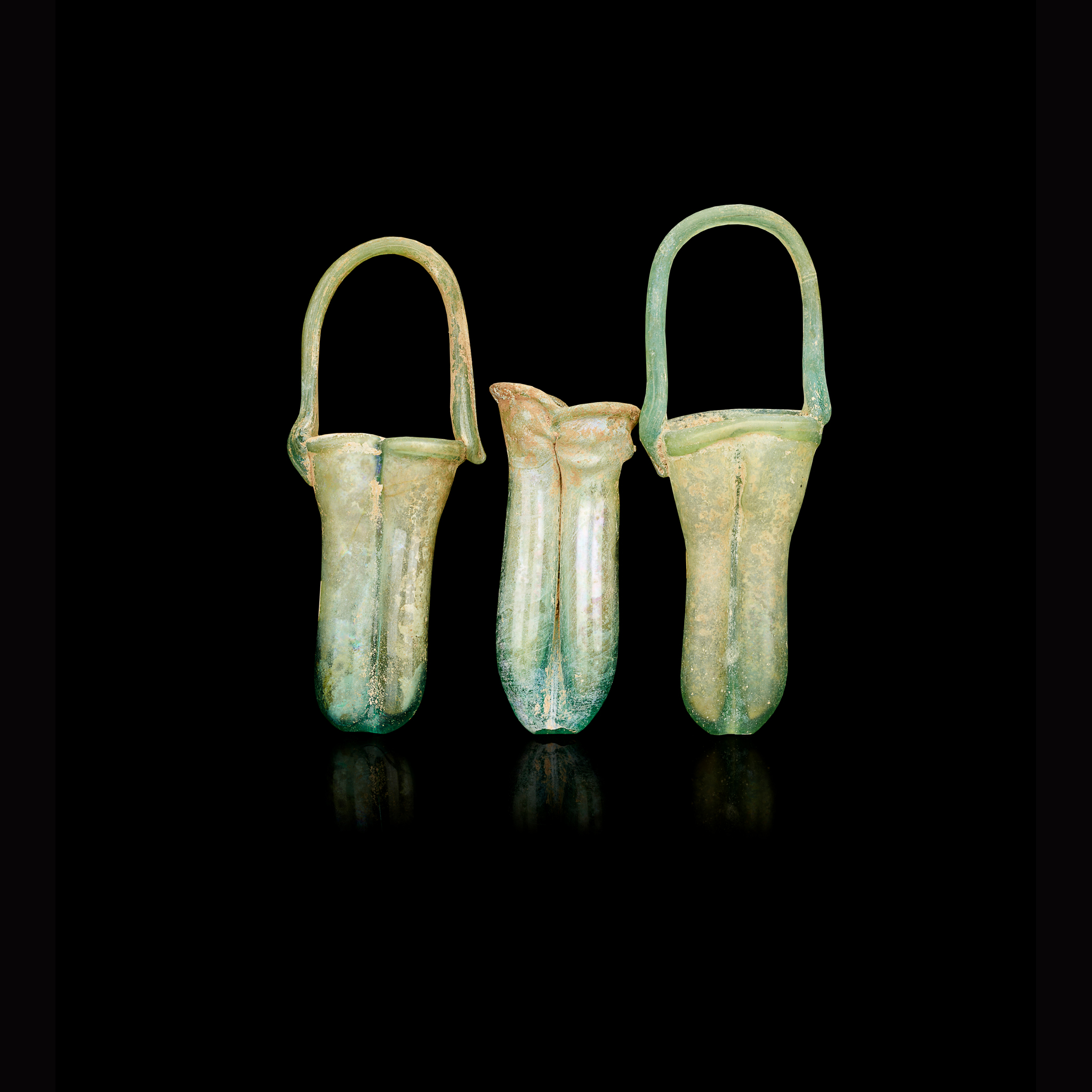 GROUP OF THREE ROMAN BASKET-HANDLED DOUBLE UNGUENTARIA