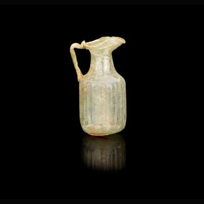the ribbed cylindrical body with a slightly sloping shoulder, the downwards flaring neck ending in a trefoil rim with rounded lip