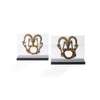 cast bronze, each example with the central ring acting at the “body” of the figure, with the head, neck and arms emerging from the top, raised skywards, the horns curving round and bitten at by predators, each raised on a bespoke mount (2)