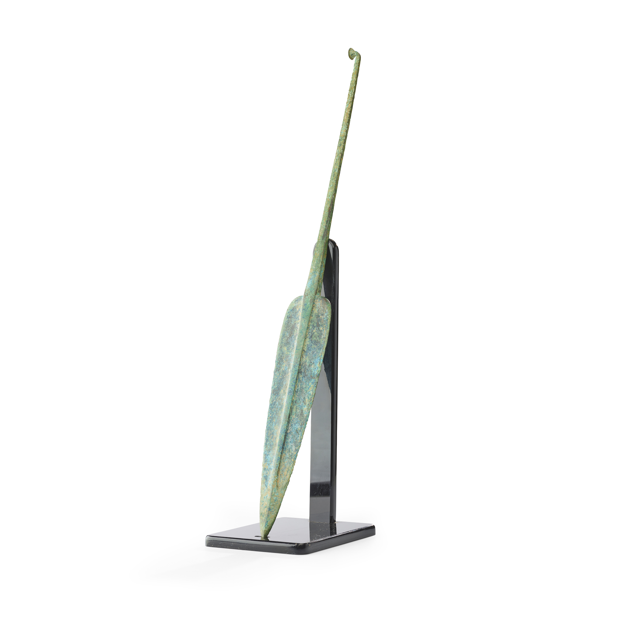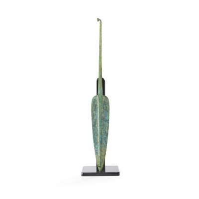 cast bronze, with leaf-shaped blade and raised central mid-rib, the shank with a curved button-headed terminal