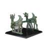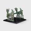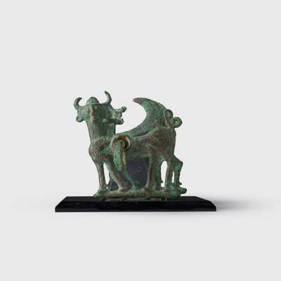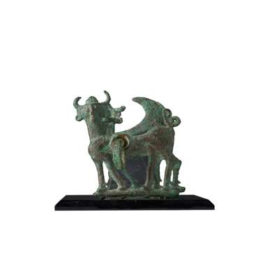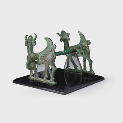 cast bronze, consisting of a rigid mouthpiece and a pair of cheek pieces formed as mythological creatures wearing a horned headdress, with striding hoofed feet, a curling tail and wings extending upwards, both perforated at the centre through which the bit has been placed, raised on a bespoke mount