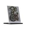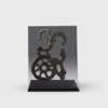 cast bronze, the spoked ring surmounted by a full figure mouflon, its ribbed horns curving round to point downwards, a feline with gaping jaws grasps the side, its legs arched, seemingly reaching up towards its intended prey, to the reverse an integral suspension loop sits behind the mouflon’s head, raised on a bespoke mount