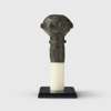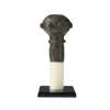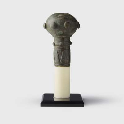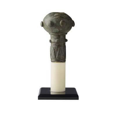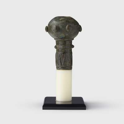 cast bronze, the cylindrical shaft with triangular engraving, leading to a raised collar, the striking head in the form of an elongated sphere, with seven projecting nodules, presented on a bespoke mount