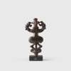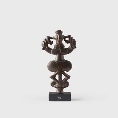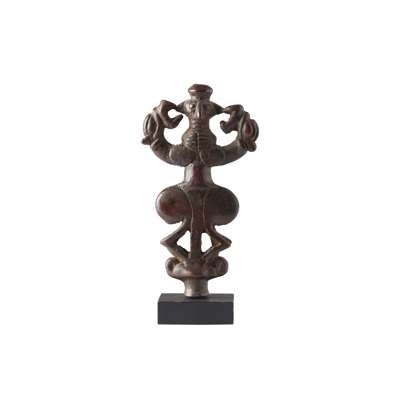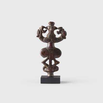 bronze, the Janus figure wearing a rounded cap, with anthropomorphic facial features the legs of a beast, flanked at either side by leopards, perforated through the centre and raised on a bespoke mount