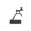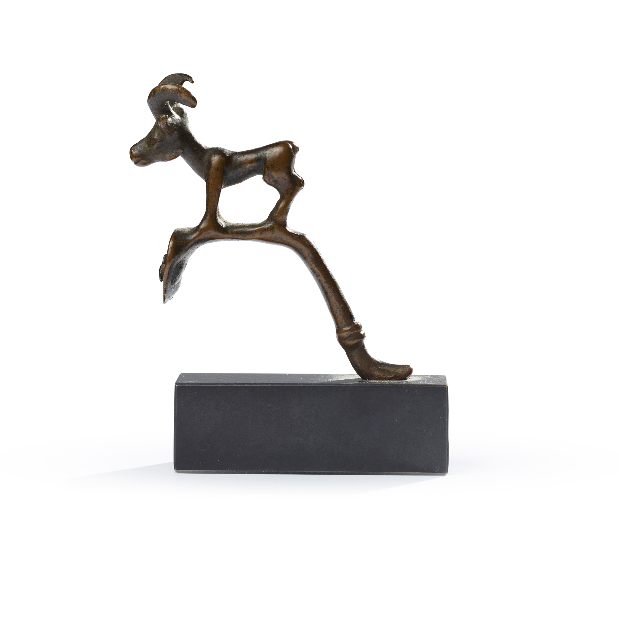 cast bronze, the handle topped with a standing ibex, with short legs, subtly sloping body and curling antlers, the hind legs slightly crouched, raised on a bespoke mount