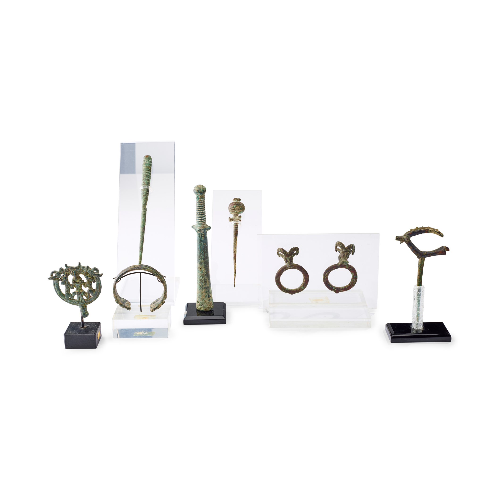 cast bronze, consisting of; three horse bits, one whetstone handle, one bronze bangle, one plain and mounted bit (ex. Charles Ede, invoice dated 13th May 1983 included), two “master of animals” openwork bronze pinheads, two dress pins, a pair of fine harness rings surmounted by ibex heads and a finial of a moufflon (12)