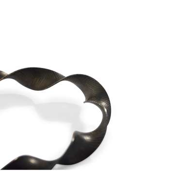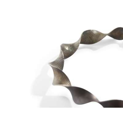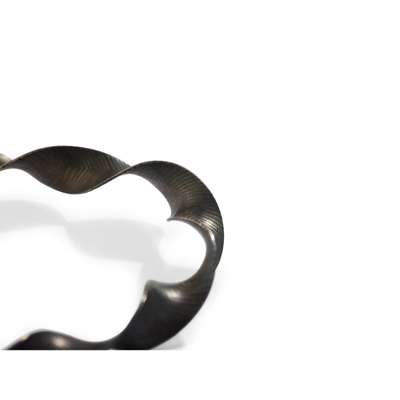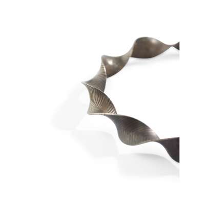 silver, spirally twisted thin bands with slightly recurved ends and a chased chevron pattern throughout