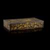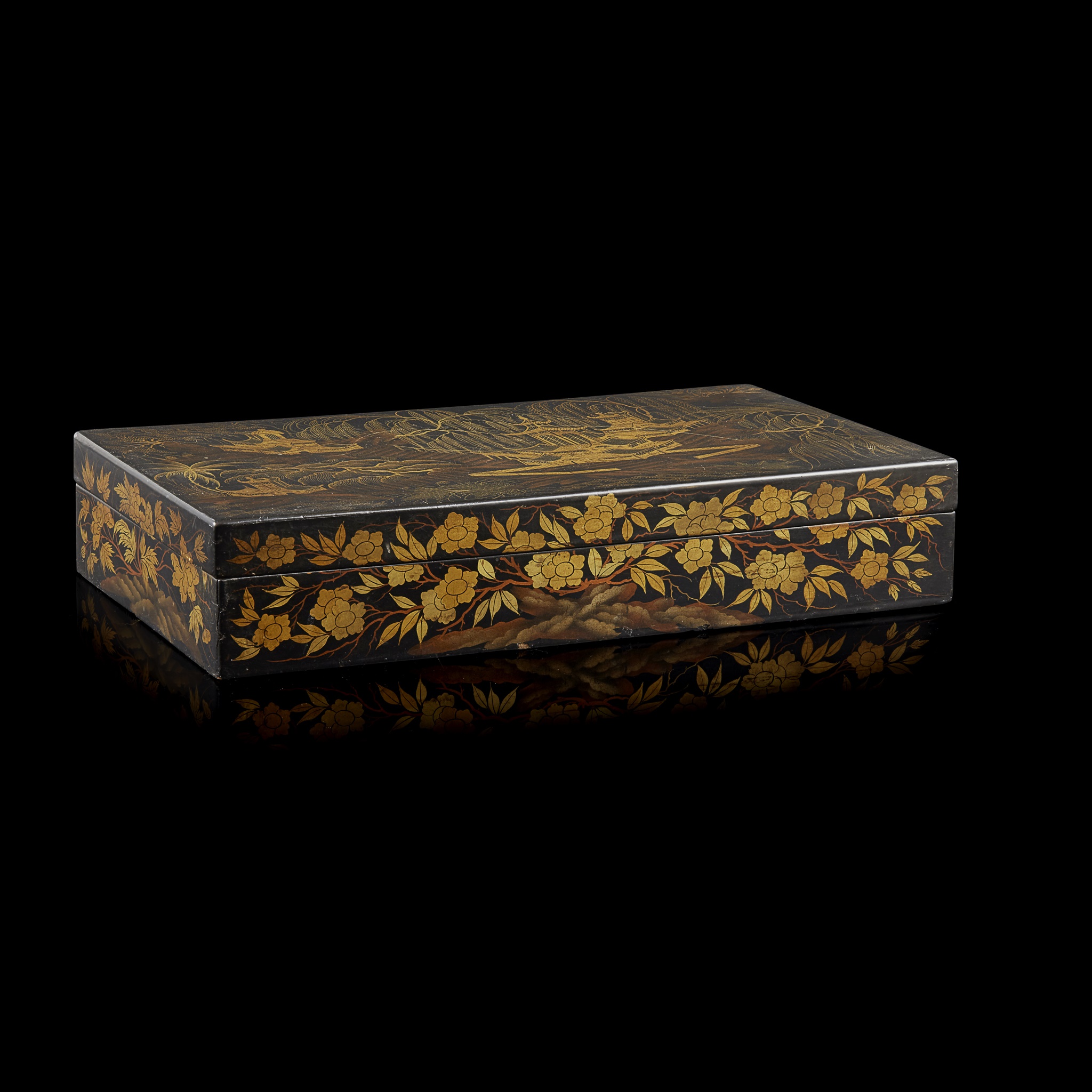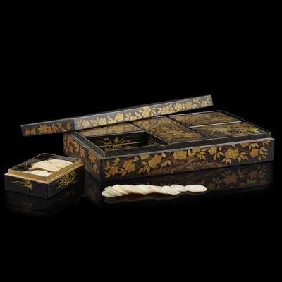 comprising 625 rectangular, circular and fish-form pieces, each incised with flowers and characteristic scenes of Chinese life, contained in five smaller gilt lacquered boxes and one large box depicting pagodas with trees set in a mountainous landscape (qty)