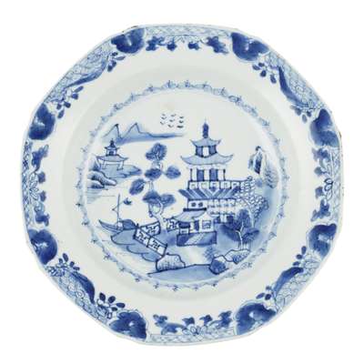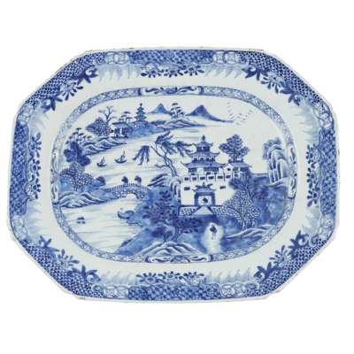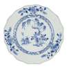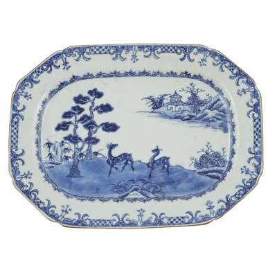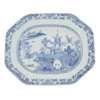 comprising four dishes of rectangular form with dented corners and two smaller dishes of foliate form, each dish decorated with a landscape scene (6)
