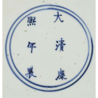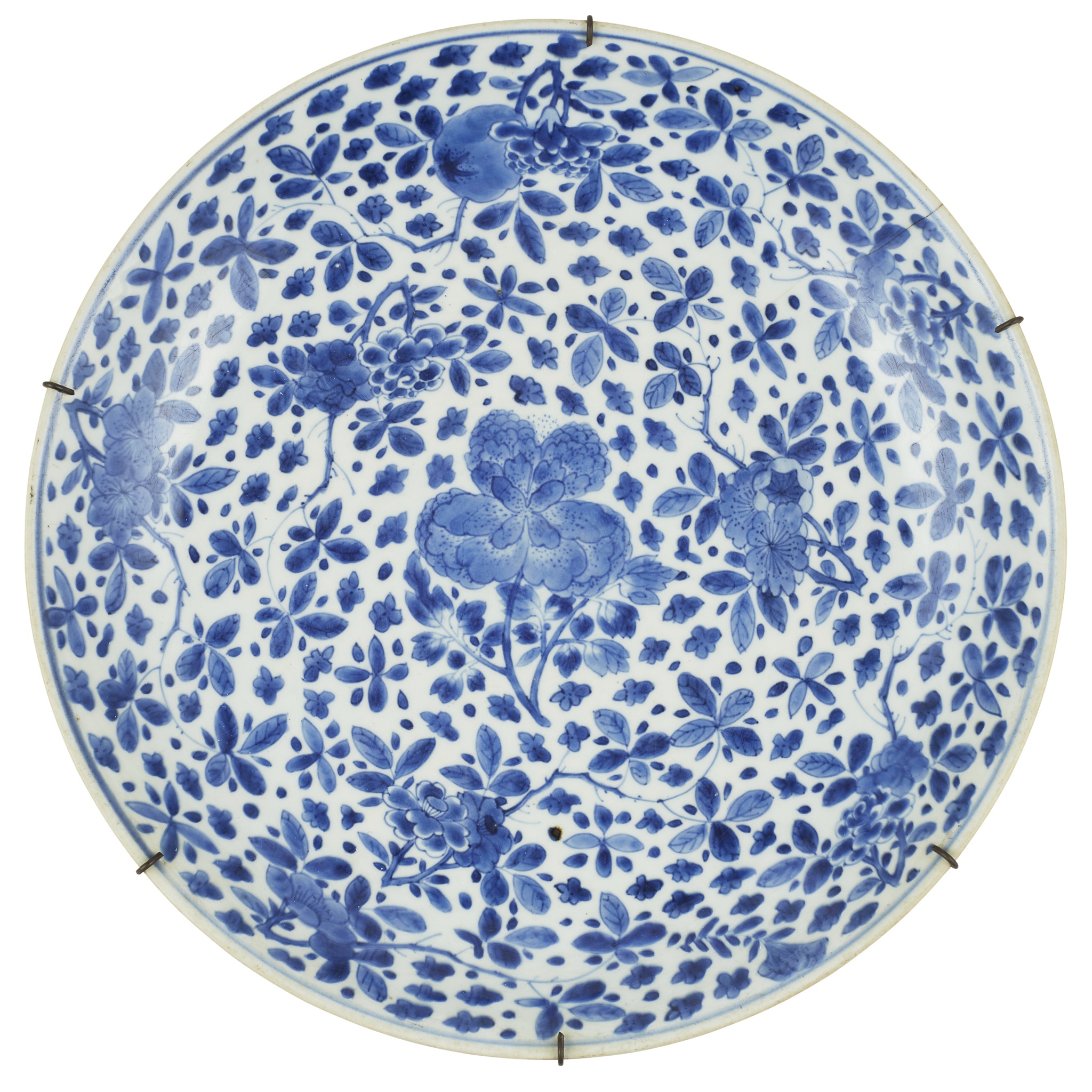 painted with peonies, cherry blossoms and leafy tendrils on the interior, the base with a six-character Kangxi reign mark within double circles