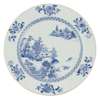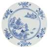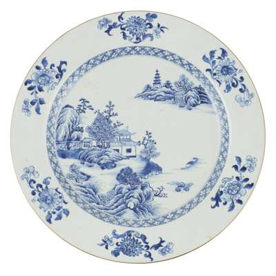 painted with residential houses and Buddhist temple tower along the river, surrounded by rugged mountains and wutong trees, the wide rim decorated with peonies and chrysanthemums (2)