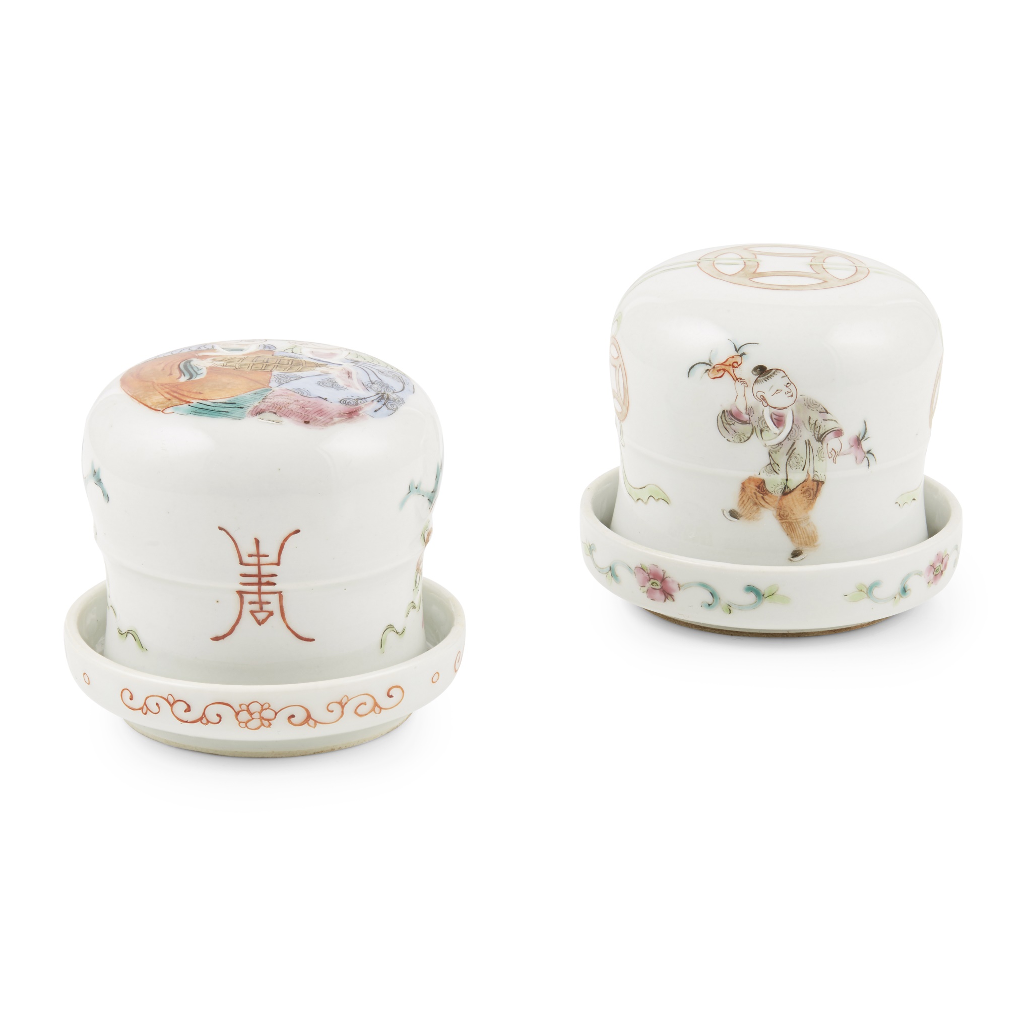 each comprising of a bell-shaped dice cup and a shallow circular dish, one painted with coin motifs together with an official holding a gold ingot 'yuan bao' in hand and a boy waving ruyi scepters, the base stamped with a six-character Tongzhi mark in red; one decorated with two deities holding a bamboo basket, the sides painted with bats holding coins with ribbons and shou longevity character, the base with a four-character Guangxu mark in double squares (2)