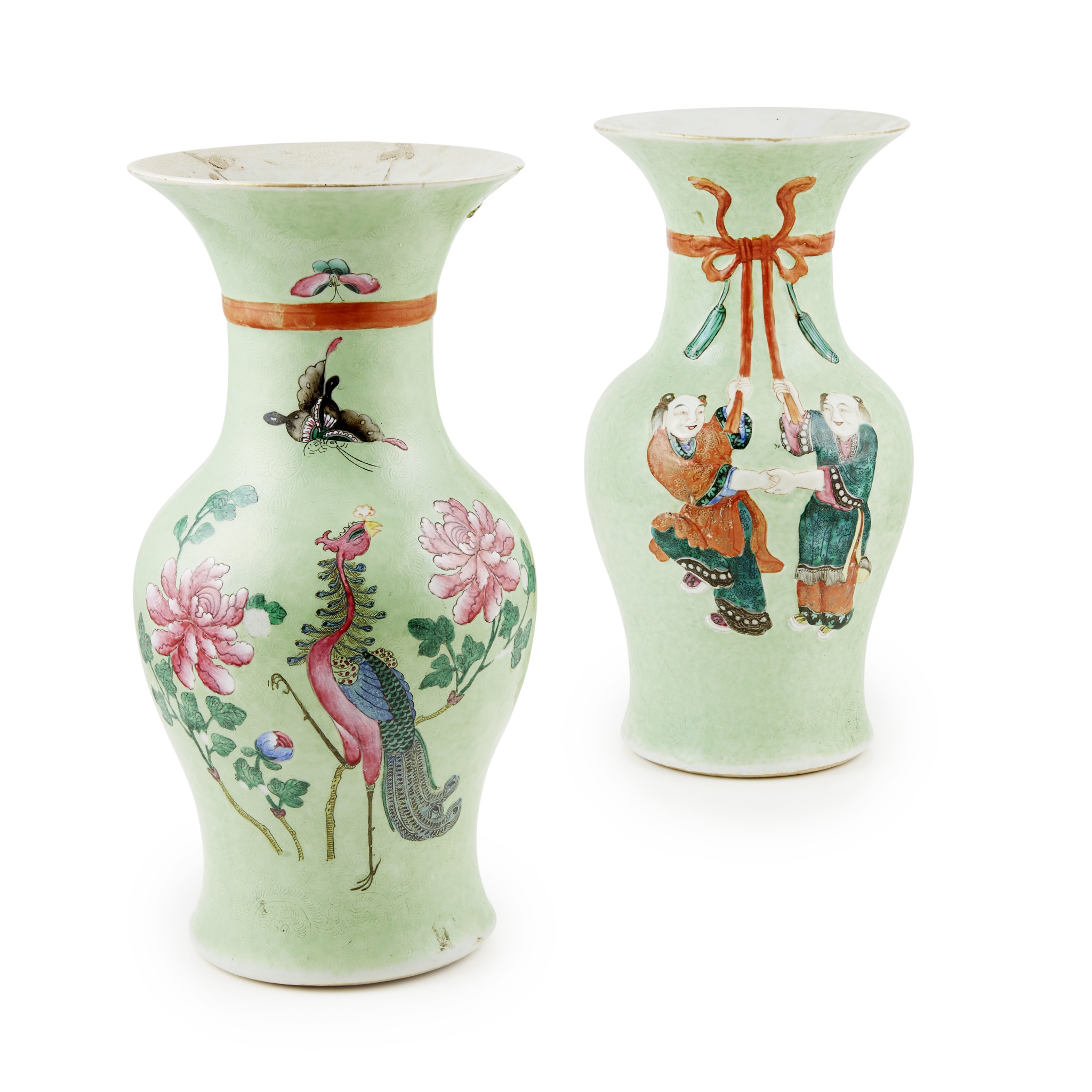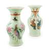 each of baluster shaped body, rising from a slightly splayed foot to a flared rim enamelled with two dancing figures holding a ribbon, a pheasant and buterflies among blossoming chrysantemum branches on a lime-green ground incised with flower motifs (2)