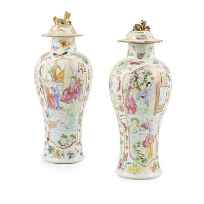PAIR OF CANTON FAMILLE ROSE VASES AND COVERS