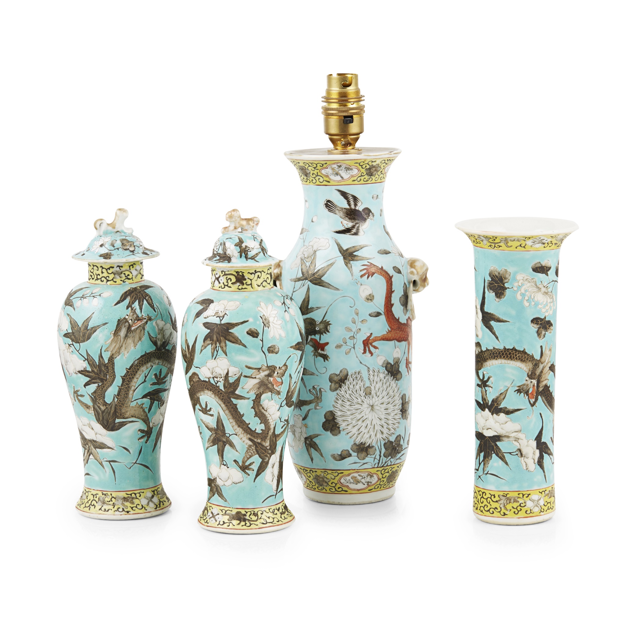 comprising a pair of baluster vases and covers, a cylindrical vase with flared rim, and a large baluster vase, each with a turquiose ground and painted with ink decoration of a flying dragon amongst foliage with large white flowerheads (4)