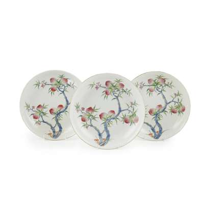 decorated in polychrome enamels with tree branches and peaches, with gilt rims, the reverse with iron red bats and a six-character Jiaqing seal marks (3)