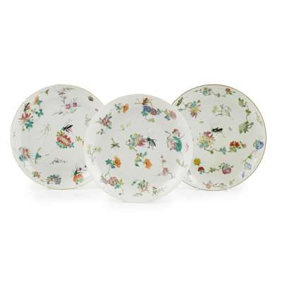 enamelled with crickets, bees, lotus, prunus, peonies, and other flowers, one with iron red Xiangfeng seal marks, another with Tongzhi seal mark, the third with an iron red peach mark (3)
