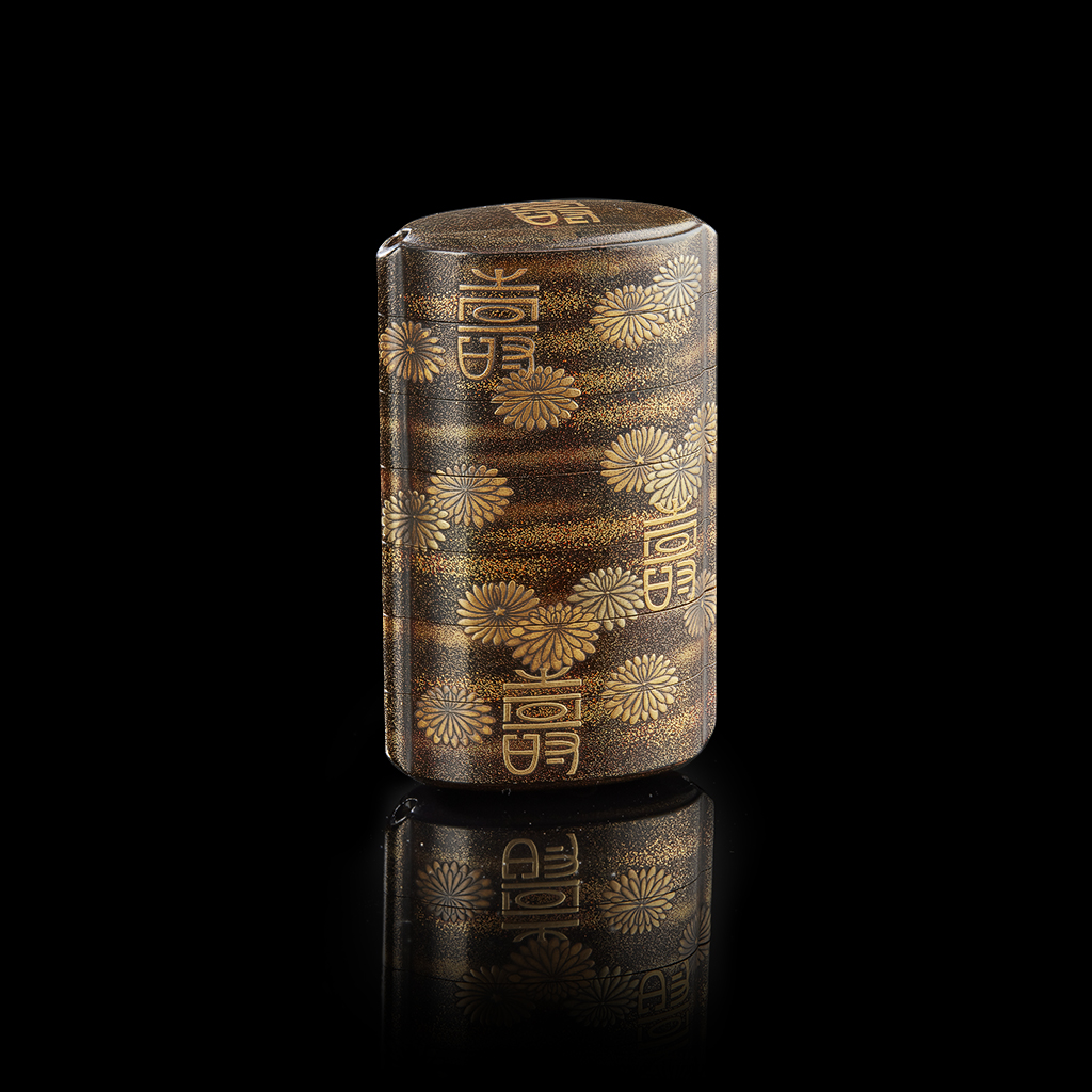 the roiro ground with a light dusting of gold powder and lacquered in gold takamakie with silver details with chrysanthemum blossoms and auspicious Shou characters, the interior of nashiji, signed Inagawa saku with seal Nakaharu
