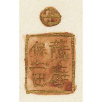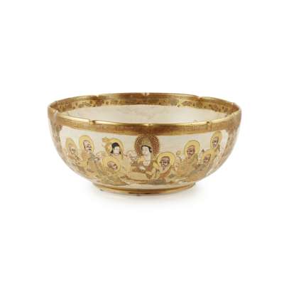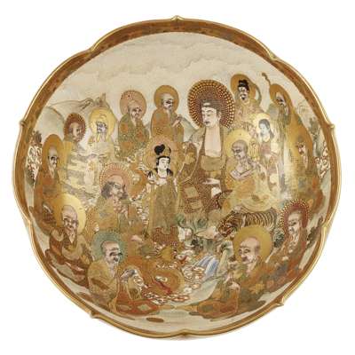 of lobed form, the interior and exterior depicting a gathering of Buddhist rakan and Kannon, reserved on a gilt ground with geometrical patterns and keyfret bands, the base signed with a gilt Hododa mark in a square reserve below a Shimazu mon
