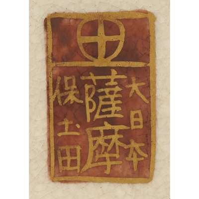 the body rising from a slightly splayed foot to a flaring neck, the panels decorated with 25 rakan and two other figures with a writhing two-clawed dragon on a gilt background, the neck decorated with another two-clawed dragon, the base signed with a gilt Hododa mark in a square reserve below a Shimazu mon
