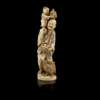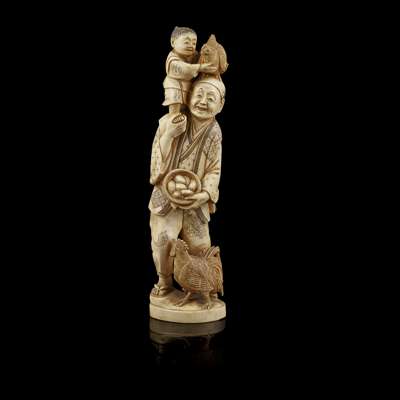 carved as a man holding a basket of eggs with a hen at his feet, a boy on his shoulder holding a hen, on a circular base, the base engraved with a two-character maker's mark 'Tomoyuki'