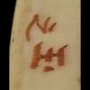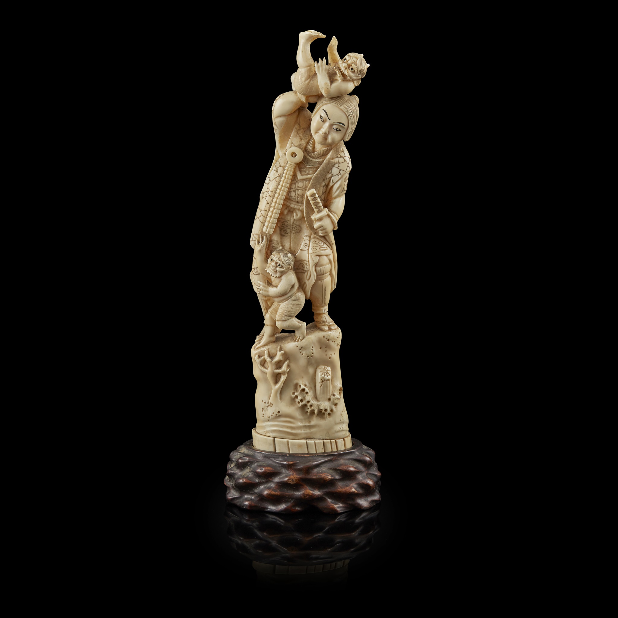depicted in a fight with demons, one was lifted up by the samurai and the other crawling along his feet, signed 'Gyokushi' on the base