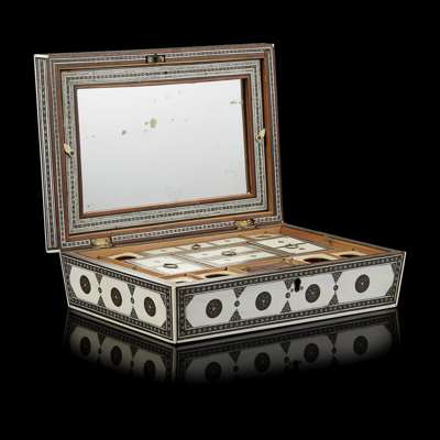 of sarcophagus form, inlaid with circles and semi-circles within geometric borders, opening to a sandalwood-lined interior fitted with compartments and a mirror to the lid