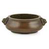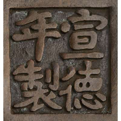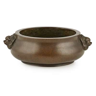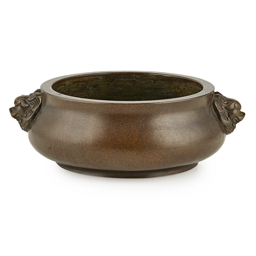 the compressed globular body below a slightly waisted neck, flanked by a pair of lion mask handles, the base cast with a four-character apocryphal Xuande mark