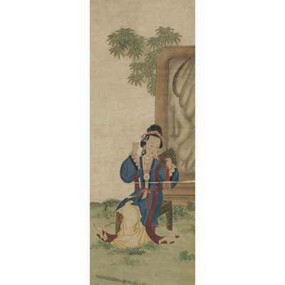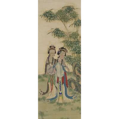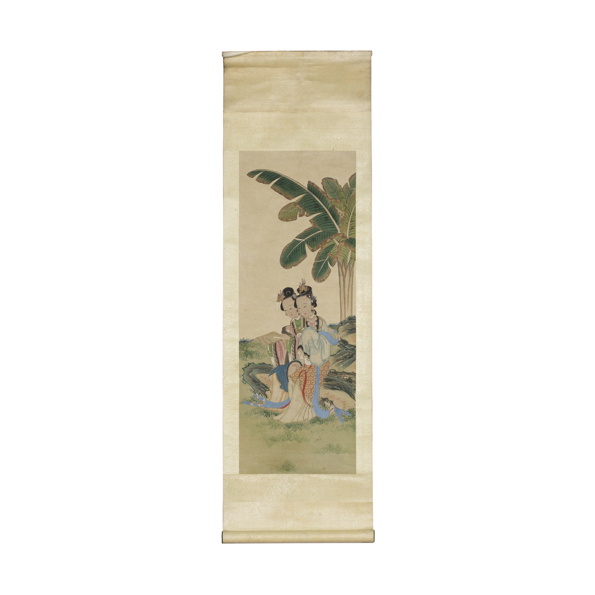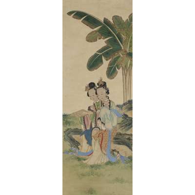 ink and colour on paper, one painted with a seated lady holding a mirror in a garden scene; one depicting two ladies walking in nature; one painted with two ladies reading a book under a banana tree (3)