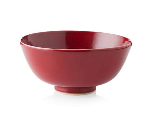 with deep rounded sides and slightly flaring rim, covered with a deep red glaze thinning to the foot rim, the base bearing a six-character Jiajing mark within double circles