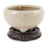 heavily potted of deep bowl shape, the sides rising to an inverted rim and supported on tripod knobbed feet, covered overall in a thick glaze with brownish crackles, with a finely carved wooden stand