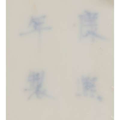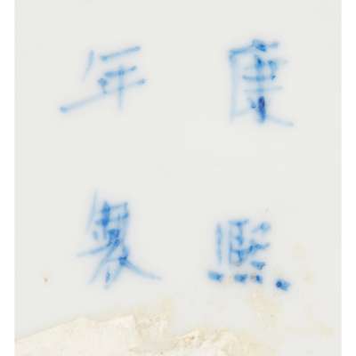 each painted with flowering prunus branching upwards on an underglaze blue 'cracked-ice' ground, the base inscribed with a four-character Kangxi mark