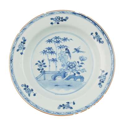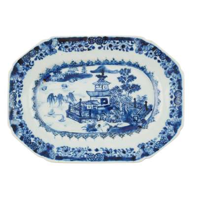 comprising: two rounded plates decorated with pavilions adjacent to a river surrounded by trees; four rounded plates painted with flowers to the interior; a rectangular plate painted with a fenced pavilion adjacent to a river