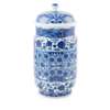 raised from a slightly tapered foot, the straight cylindrical body extended to a waisted neck, the body painted delicately with plum blossoms in small panels between two bands of scrolling foliage and lotus, the neck decorated with crashing waves, the lid topped with a finial painted with flower