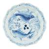 thinly moulded on an unglazed flattened base to notched rim, the interior painted with two fish to each side, crashing waves to the other in underglaze blue