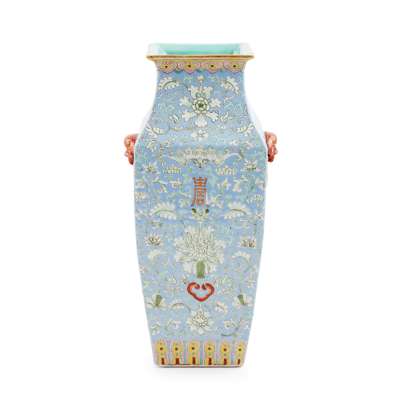sturdily potted from a countersunk base to a tapered square body, waisted neck and everted rim, each side of the body richly enamelled with scrolling Po-phase flowers with a suspending ruyi motif, front and back with gilded 'Shou' underneath a wing-spread bat, sides with a mask of a mythical beast as handles, all reserved on a sky-blue ground