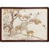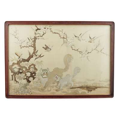 comprising: one embroidery depicting a pair of deer with the younger holding lingzhi fungus with its mouth accompanied by cranes, a butterfly, and a bird under a pine tree; one depicting a pair of mythical beasts with birds and butterfly under a pine tree, both reserved on golden silk cloth, both framed